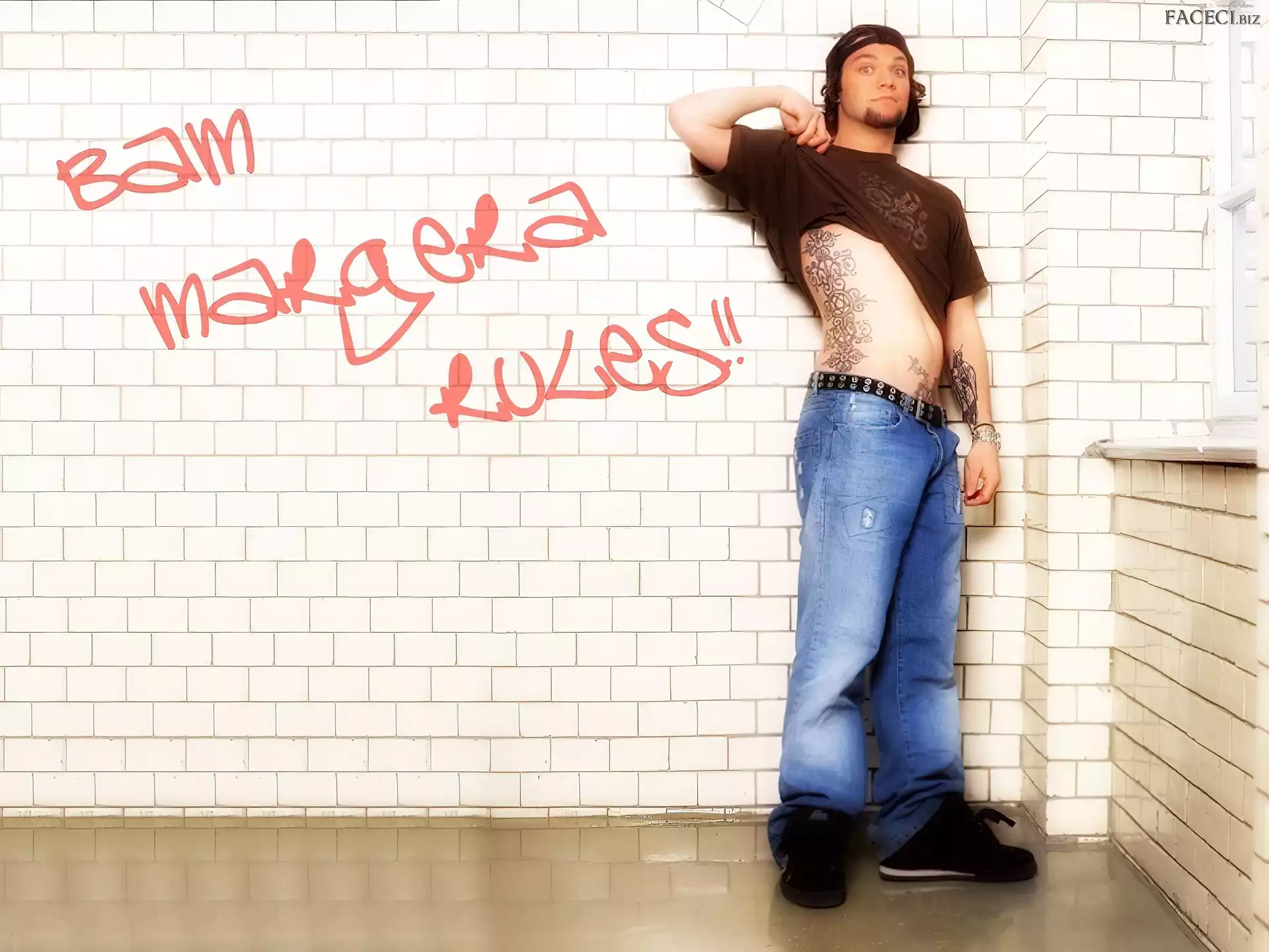 kurtka, Bam Margera, rozpięta okulary, Bam Margera, butelka włosy, Bam Margera, ciemne zegarek, Bam Margera, deskorolka okulary, Bam Margera, twarze t-shirt, Bam Margera, brązowy